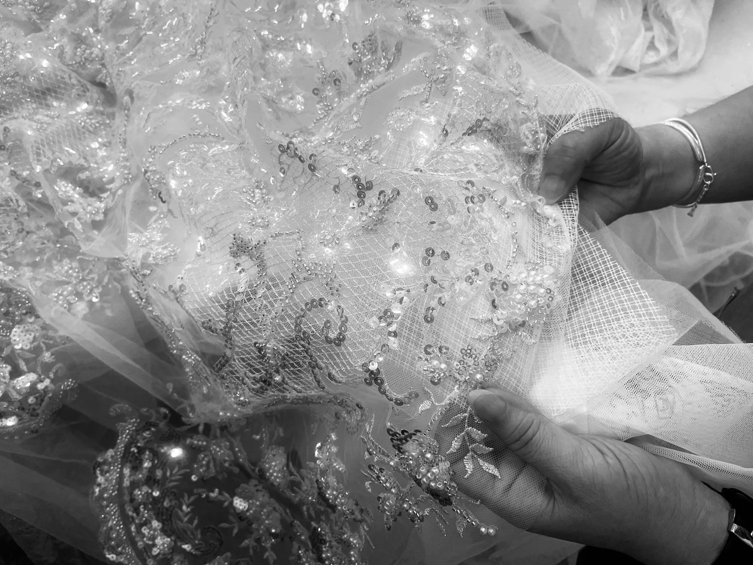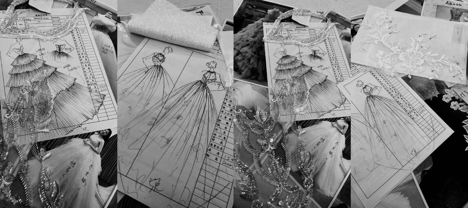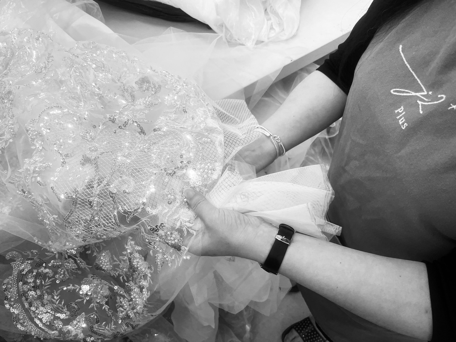 5.樣衣調整後,進行縫合,完成繡珠、鑲嵌等純手作。全部完工後新人可最後試穿,查看裝飾物及縫合情況,進行最後的驗收,如果沒有問題,就可以取回家了。